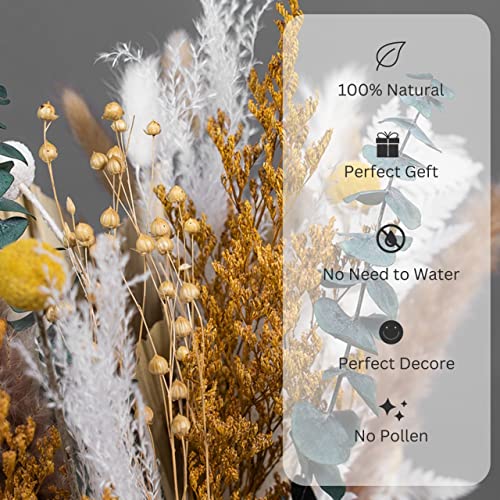 - PACKGAE CONTAINS: 2 Large Dried Leaves, 4 Craspedia Billy Balls (Yellow), 1 Small Dried Leaves, 2 White Reed Grass, 2 Eucalyptus, 2 Ferm Plant, 4 Bunny Tails, 2 Mist Plant, 4 Pampass Grass, 1 Berries Plant
